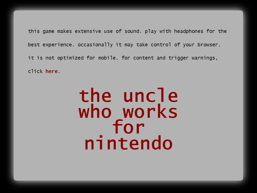 An unnerving visual novel parodizing the playground phrase of "I know it because my uncle works for Nintendo". Good for those who want to dabble into horror, but can't stand those damn screamers.